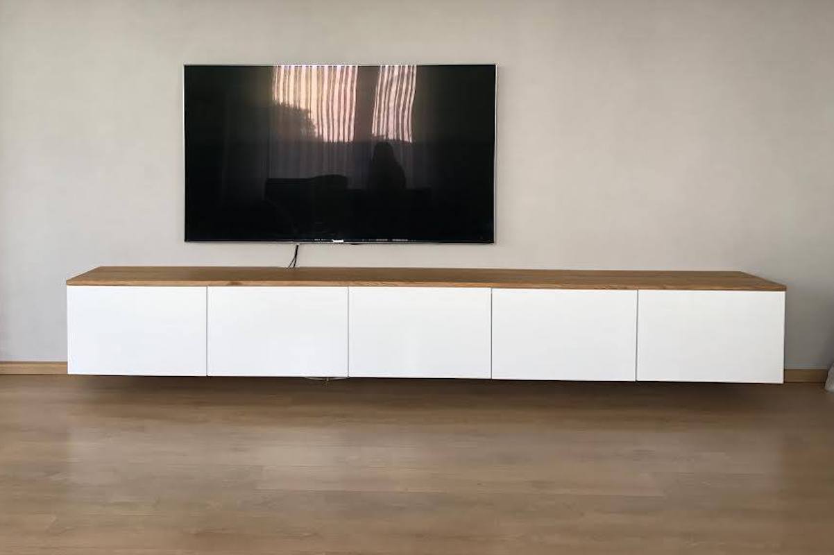 Floating bathroom cabinet in oak, with 2 drawers. Measurements 160x50x40cm and finished with a matte varnish.